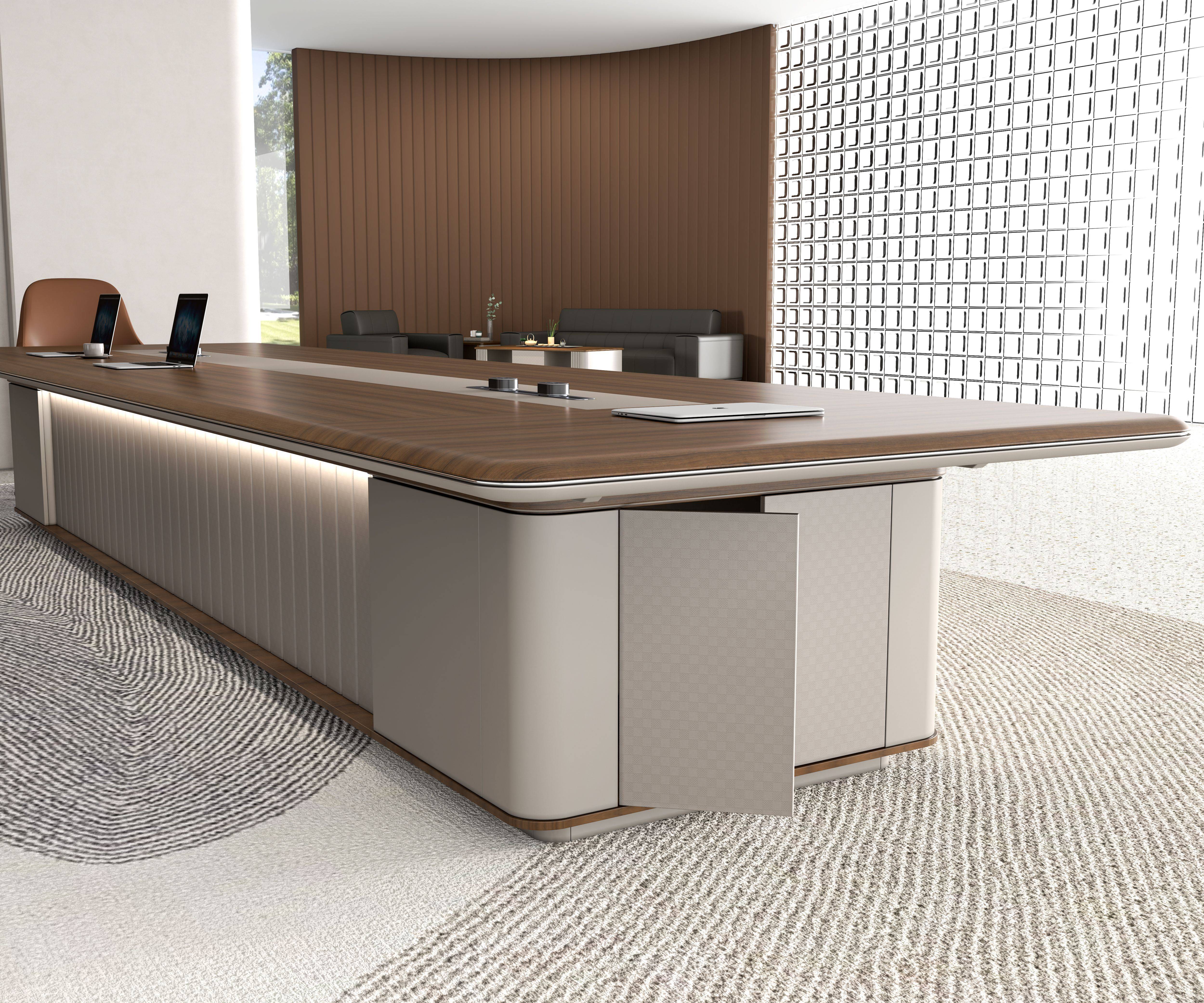 1 桌面零甲醛高密度镂铣板基材,健康环保PET纳米覆膜饰面,其他部分采用优质三聚氰胺饰面颗粒板,2 含轨道线盒 含灯带