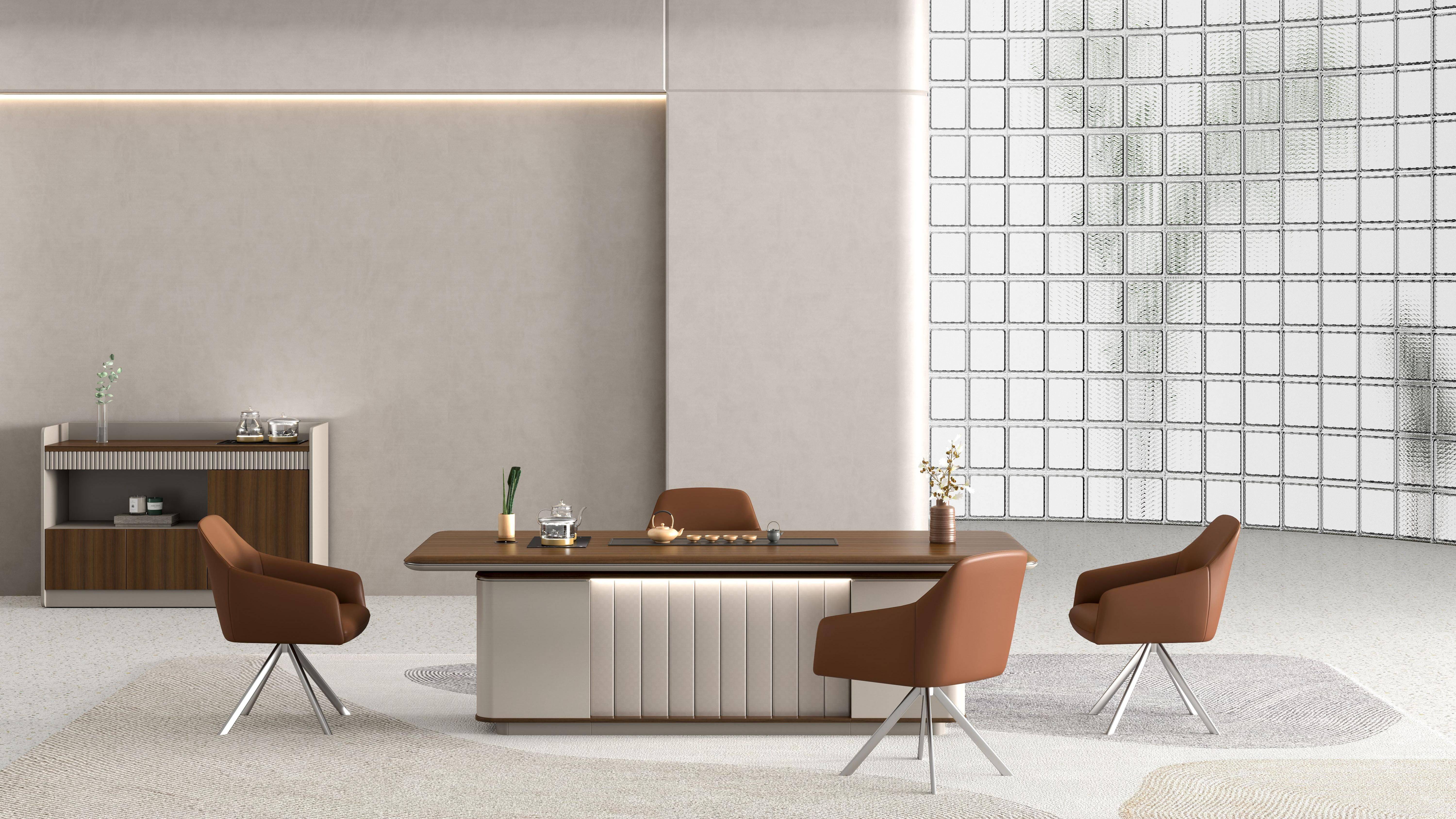 1 桌面,附柜顶板零甲醛高密度镂铣板基材,健康环保PET纳米覆膜饰面,其他部分采用优质三聚氰胺饰面颗粒板,2 含多功能线盒 含灯带